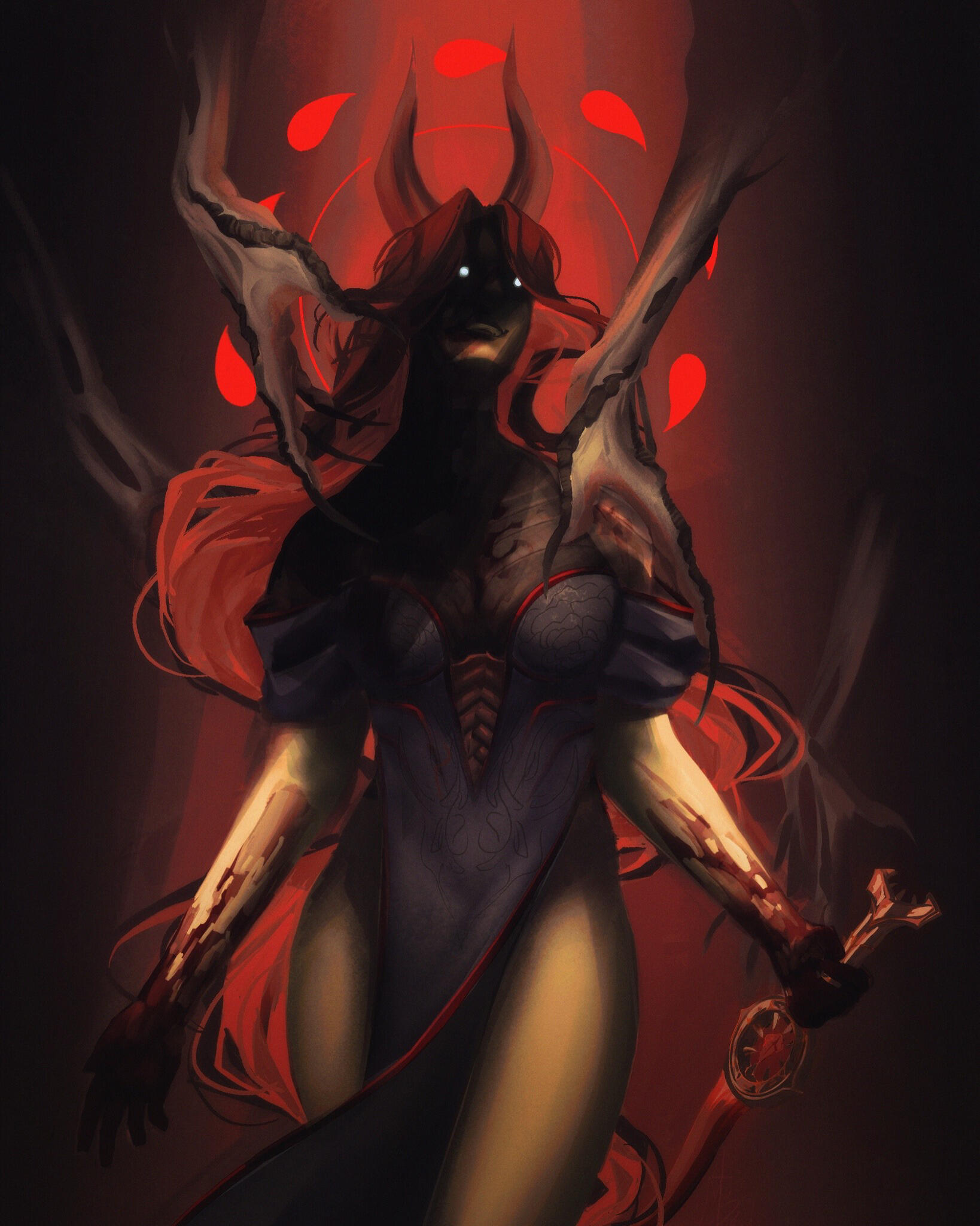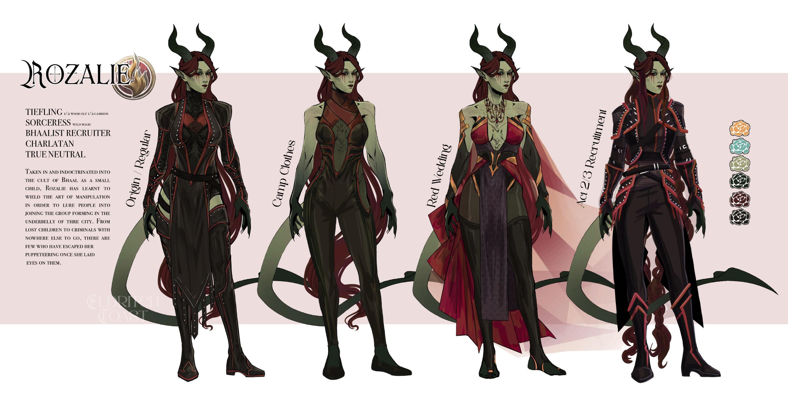 Being the youngest of two sisters born to wood elf and cambion parents, Rozalie didn’t have as much of a recollection of her biological family as her older sister Elyr did. She vaguely remembered living with her father in their cottage in the woods, but most of those memories are gone by now and more so facts she can recall. After her father was assassinated by a Bhaalist assassin, Roza found herself extremely susceptible to the murder god’s influence, even if she herself didn’t know that was it at the time.After their father’s passing, both her and Elyr got taken in by a paladin living in a temple of Mielikki near Baldur’s Gate. The sisters lived relatively normally while there, however there was always this strange force in the back of Roza’s mind compelling her to venture into the Shadow Cursed lands. Most times, either Elyr or their guardian would be there to stop her before it was too late, however on one such occasions, no one noticed fast enough and she found herself walking straight into the forest in the direction of Moonrise Towers.She eventually found herself face to face with Ketheric Thorm. The undead general looked after Rozalie for most of her formative years, using her as a way to cope with the loss of his daughter for the second time. However, Roza knew Moonrise Towers wasn’t her one true purpose, and soon after, she found herself in the cult of Bhaal’s lair underneath Baldur’s Gate, who indoctrinated her into the cult.Roza found herself living pretty well among cultists, be it because of her hellish ancestry or just her sheer will to survive at all costs, and by the time she reached her early twenties, she was appointed as a head recruiter, prowling the streets for vulnerable people to be taken into Bhaal’s clutches the same way she was. She learnt to be everything her current target needed, be it a mother figure, a support system or an object of desire, which helped her understand how to manipulate people more and more, which in turn allowed her to sink her claws into increasingly powerful targets.Before she knew it, thirty years since her original disappearance had gone by. She was the cult’s High Priestess and married to the chosen of Bhaal himself, the highest position she could possibly hope to achieve while not being a bhaalspawn. And things would have been as perfect as they could get in her situation if it wasn’t for Orin killing the Dark Urge. After the albino Dragonborn, Roza was the next on the deathbringer’s list.Left for dead in Moonrise Towers, Roza was found by Ketherick, who wasn’t about to lose a second daughter. She was handed over to Kressa Bonedaughter to be revived, however instead of being sent out on the nautiloid, she remained in Moonrise Towers, where she conspired her revenge against Orin until Thorm was defeated by a group of tadpoled adventurers, with who she teams up with on the way back to Baldur’s Gate.
