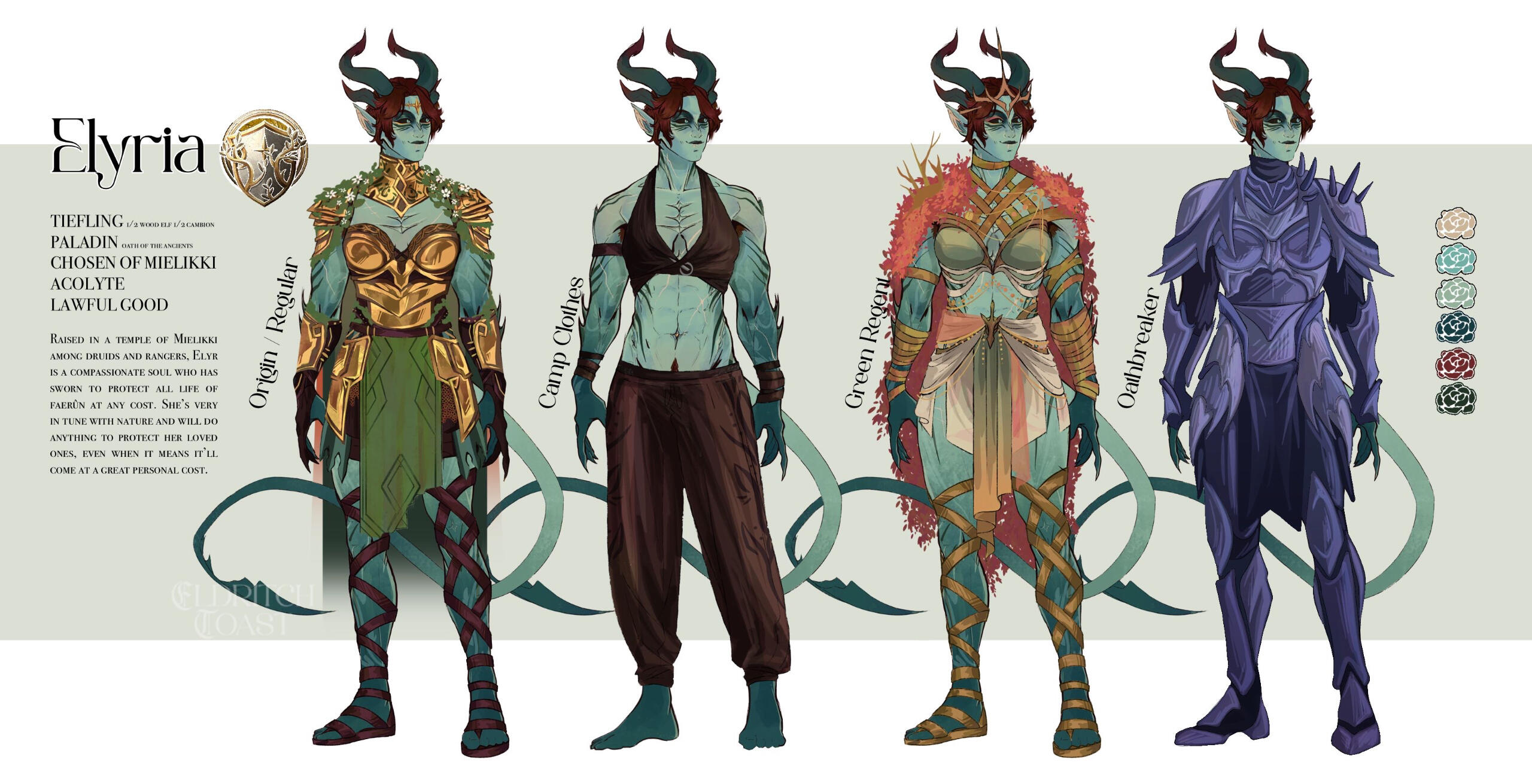 Born out of the unexpected love story between a Cambion Sorceress and a Half-Elf Druid, Elyr was bound to have a rather unconventional upbringing from the start. Her mother Dalia, a servant of Mephistopheles, was part of the efforts to keep Raphael from getting the Crown of Karsus, which in turn kept her away from her family. In an effort to keep Elyria and Roza safe in case Raphael found out, the two of them lived solely with their father, Elorin, a former Chosen of Mielikki and Green Regent, in hopes to get them to connect with their Druid ancestry in the future.After finding out about Dalia’s involvement in keeping him away from the crown, Raphael struck a deal with a Bhaalist assassin as a way to get back at her. The following bloodshed resulted in Elorin sacrificing himself to save his daughters, yet he could not save Roza from becoming susceptible to the assassin’s Bhaalist magic, something that would leave her with a permanent mark. Realising just how unsafe it truly was to have them around while Raphael was alive, Dalia figured it’d be for the best if she disappeared from her children’s life for good, and so she left them at the doorstep of a Mielikkian temple in the wilderness.Even though the Temple’s Mielikkian Clerics had their hesitations taking in two hellspawn, the sisters were taken in by the Temple’s resident Elveln Paladin Tasalor, who raised them as his own. Being just like her father, Elyria had a connection with natural magic, much to the happiness of the local Nature Goddess worshippers, yet her sister seemed to lack her connection to the wilderness, instead focusing her whole attention on blades and steel, following the guidance of a voice she heard in her head that everyone else seemed to consider an imaginary friend if anything.After hearing this voice in her head for so long, Roza followed it to the edge of the Shadow-Cursed Lands, never to be seen again. Feeling guilty for her sister’s disappearance, Elyr swore at the early age of 9 that she’d make it her life’s work to find a way to lift the deathly curse and find her sister. She trained under Tasalor’s mentorship to become a Paladin of Mielikki, and after swearing under the Oath of the Ancients, she set off with her fellow Mielikki worshipper and best friend Nadia to cleanse the Sword Coast from the creatures of Darkness in search of a way to lift the Shadow Curse.Thirty years went by for the duo in the blink of an eye, and thirty years was how long it took for Elyr to be able to make any progress on her quest to find her sister. During a visit to the temple they were raised in, Elyr and Nadia found out Tasalor had also gone missing near the Cursed Lands and decided to investigate his whereabouts. It’s while in this investigation that the two of them got ambushed by Thorm’s soldiers and taken to Moonrise Towers, where Elyr got put in the Nautiloid and had the tadpole inserted into her eye.